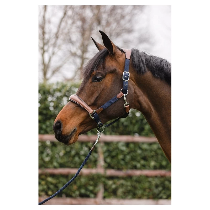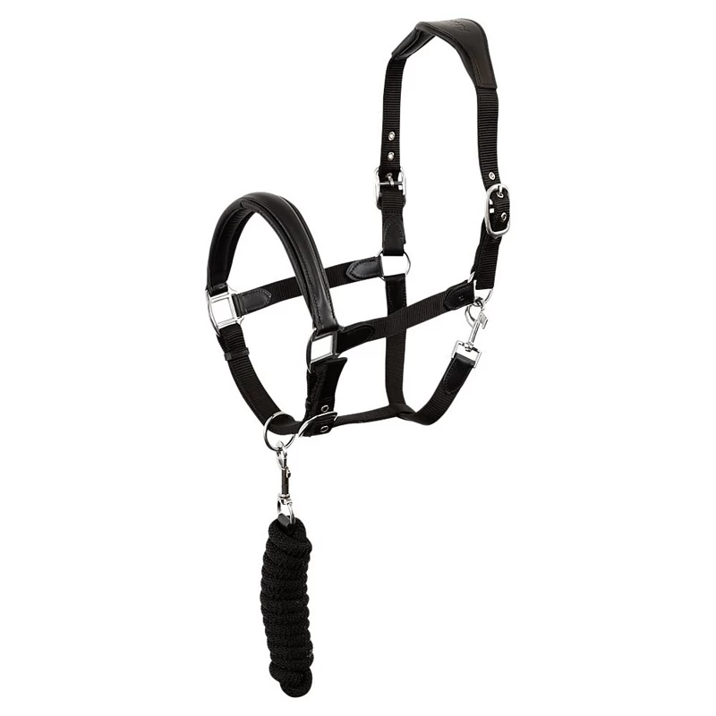 halter on the horse’s head. The halter is adjustable with buckles and features a