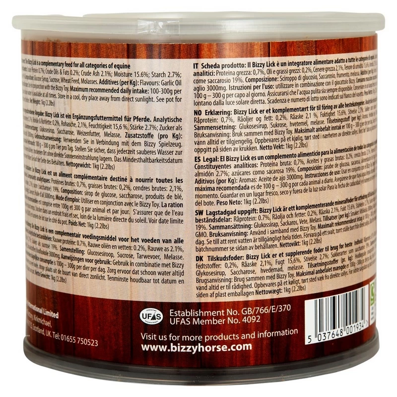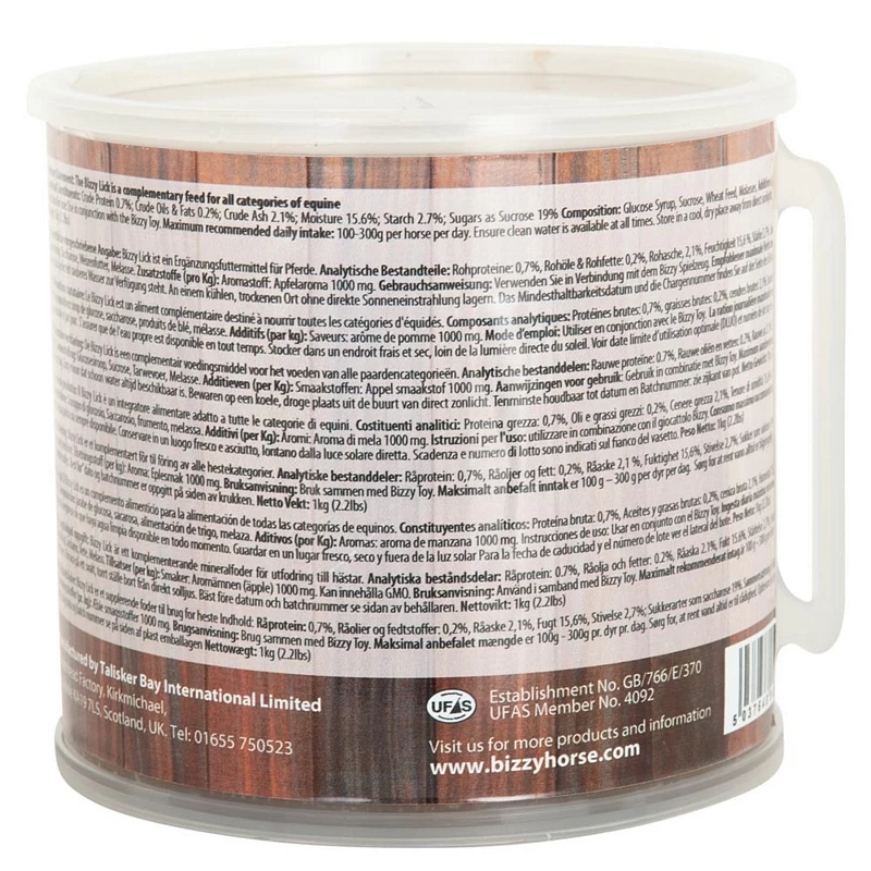The Bizzy Lickit horse lick weighs one kilogram and can be used in combination with the Bizzy Ball to enrich the environment of the horse and to prevent boredom. The consistence of the lick is rock-hard, making it nearly impossible