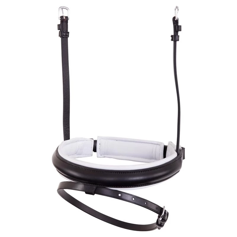 Crank flash noseband, round raised with soft padded lining and matching lined chin pad. Includes flash strap. Suitable for bridles with the noseband straps stitched at the ends of the crown, like the BR Anatomic bridles. The black noseband features shiny, silver-coloured buckles. The Tobacco noseband features