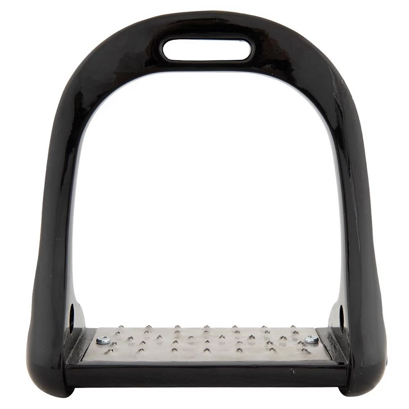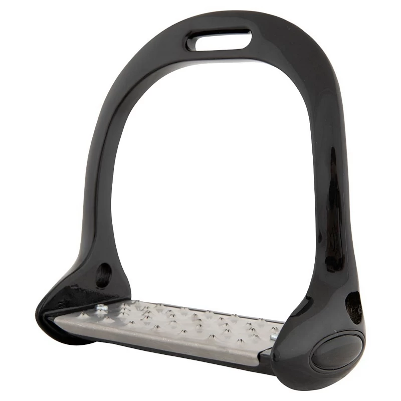 This stirrup is made of galvanized aluminium with a powder coating. The slightly curved design offers the rider optimal support and balance. The stainless steel tread has a coarse, jagged pattern and is extra wide which evenly distributes the foot pressure.