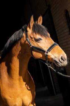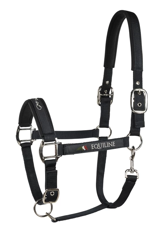 Adjustable polypropylene halter with soft Neoprene lining. Snap hook and satin-finish metal rings.