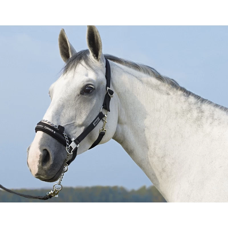With the halter Control you improve the control of your horse and you increase your security through the integrated guided chain. Control is made possible in three stages. Normal use: The chain is attached to the halter ring. Use with effect: the chain is attached to the chain ring without tension. Using strong effect: the chain is attached tight. A good adaptation to the horse head is needed. In the interest of the animal, the user should use this application within the limits of reasonableness.