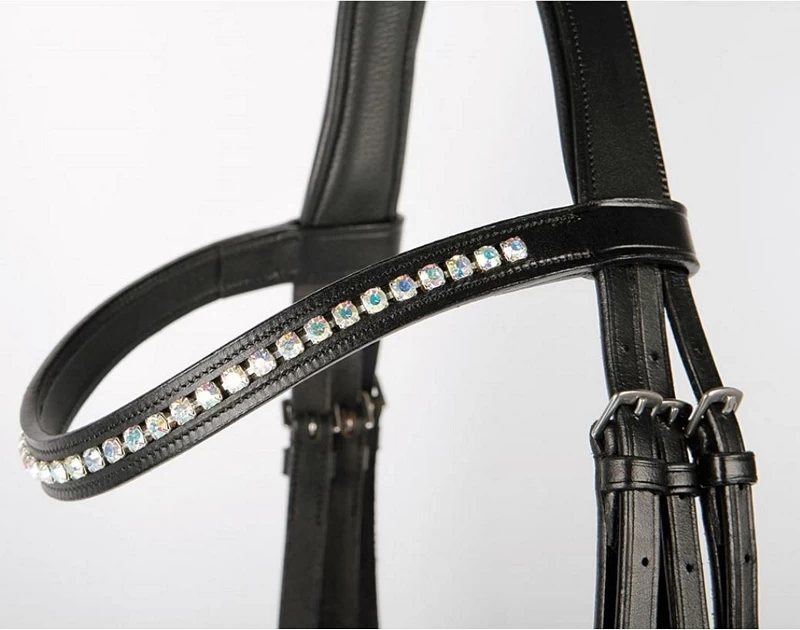 Luxury bridle made of high quality leather with wide, soft padded ergonomic flash noseband and browband in wave form with AB-crystals. Blind fasteners.