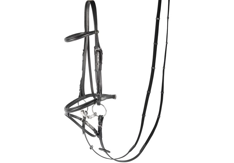 Leather bridle with black padded combined noseband and stainless steel hardware. Including web reins with stops.