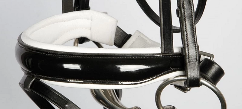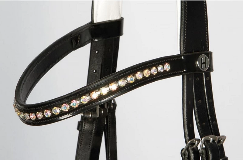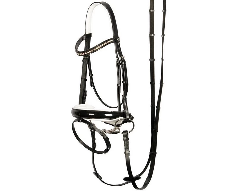Luxury bridle made of high quality leather with white padded flash noseband (4cm) and browband in wave form with AB-crystals. Blind fasteners. Including web
