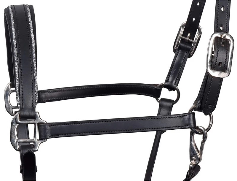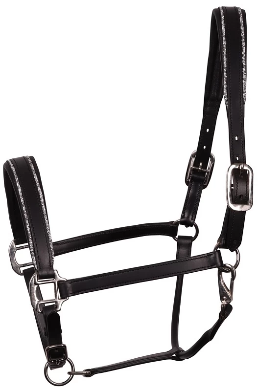 Leather halter with glitter on both sides of the noseband and headpiece. The headpiece is adjustable on both sides and adjustable on the noseband. Extra supple and comfortable, softly padded.