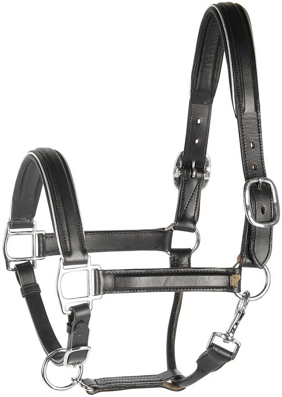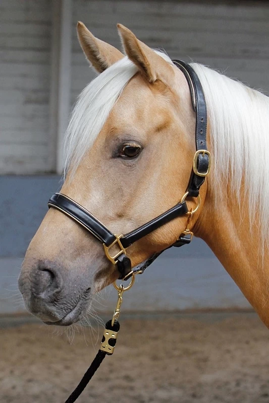 Leather headcollar with silver or gold piping, double buckle adjustment on the headpiece and singel on the chin. Brass plated hardware