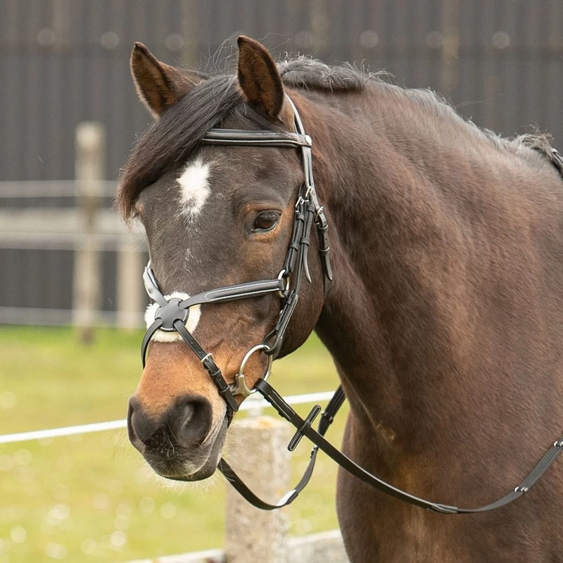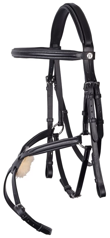 Mexican bridle with soft padding on the browband, noseband and headpiece and contrast stitching. Equipped with soft sheepskin protection under the center of the noseband. With included web reins.