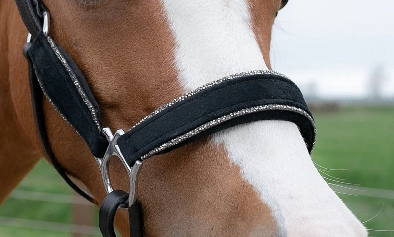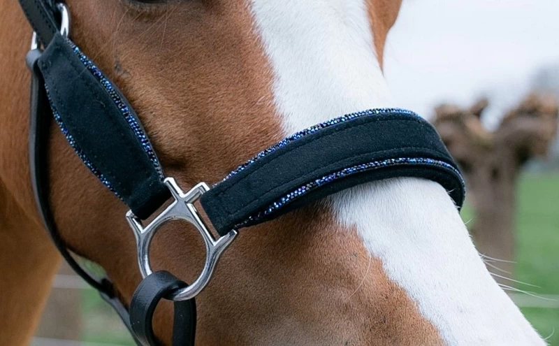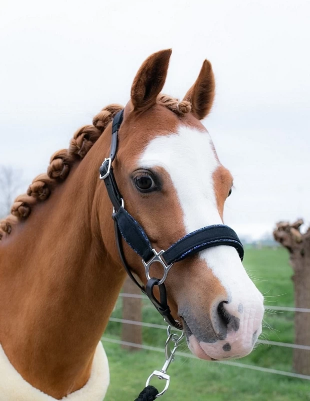 The HB Showtime Velvet Glitter Halter for small sizes is a luxurious combination halter made of leather and decorated with velvet and glittering accents. The headpiece consists of leather with soft velvet padding for extra comfort. The noseband is made of velvet at the top and also has a velvet lining on the inside. The mouthpieces are also lined with velvet. Both the mouthpieces and noseband have glitter. This halter is adjustable in adjustable in several places, so that it fits small horses and ponies.