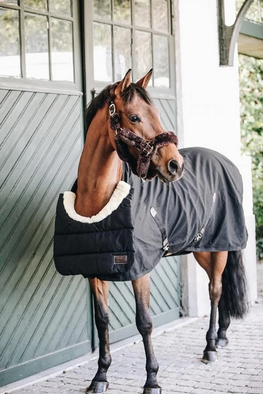 The Winter BIB is the ideal pad to protect your horse’s chest from rubs caused by rugs. It is a pad that exists out of two flaps which you put over the front of the rug where the front closures are. One flap will be on the inside of the rug, directly against the chest of the horse. The other flap then hangs on the outside of the rug to keep the BIB in place. Both edges of the BIB have notches to make sure the BIB stays in place.Prevents rubbing of the chest or withers The flap that is in direct contact with the horse’s skin is lined with artificial rabbit skin. This extremely soft material offers an utmost comfortable feeling. Artificial sheepskin was attached to the fold of the Winter BIB, to prevent rubbing of the neck and to offer even more comfort. The outer fabric of the BIB is 100% peached polyester. Not only does it prevent rubbing, the BIB also equalizes the pressure the rug puts on the horse’s chest. The BIB can also be used in the same way to protect the withers and is ideal to use in combination with all kinds of rugs. The BIB is machine washable at 30°, no dryer. Available in navy.