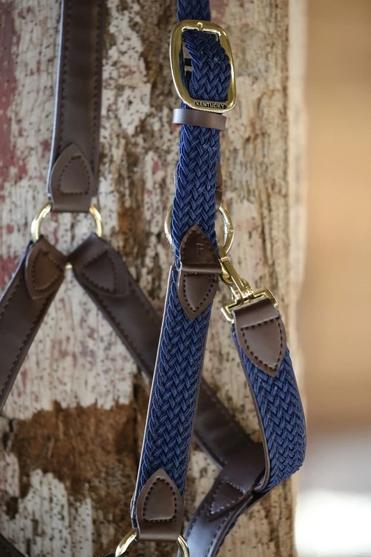 The Plaited Nylon Halter is made of artificial leather (100% animal friendly) and has a navy nylon braided design. This artificial leather does not absorb water or dirt, does not break or change colour. It’s more flexible than real leather and therefore much nicer to use. The size can be adjusted on the left side of the head and on the chin. The pen can penetrate the braided design anywhere and therefore enables a perfect fit. All closures are gold coloured and are a perfect match with are leads. The Plaited Nylon Halter can be cleaned with our Kentucky Horsewear Tack Cleaner and is machine washable at 30°, no dryer. The Tack Cleaner was specially developed to clean our artificial leather. Very easy and efficient! Do not clean with glycerine soap.