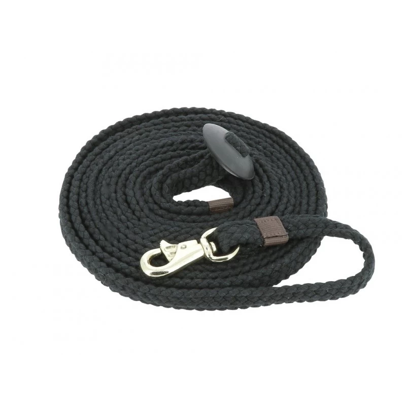 Polyester exercise lunge with large snap hook and brass plate. Rubber stopper.