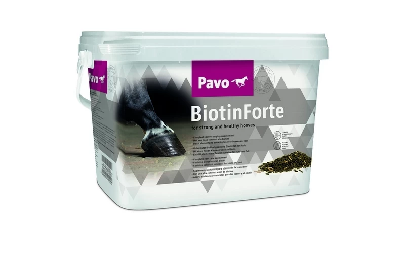Pavo BiotinForte contains biotin (vitamin B8), copper, zinc and essential amino acids to support an optimum horn quality. Research has shown that a proper combination of these substances is more effective than just a high dose of biotin. In Pavo BiotinForte these ratios are perfectly balanced, so you give your horse optimum support with just a single product. An extra benefit is the positive effect on the quality of the coat, as hair is built from the same building blocks as horn. Your horse’s coat will get a stunning shine. Vitamin B8 is required for the development and maintenance of structures and connective tissues in the body that need to stretch and withstand a lot of pressure. Therefore Pavo BiotinForte also offers building blocks for the joints and arteries. Pavo BiotinForte does not contain wheat, so this supplement is also suitable for horses that are sensitive to gluten.