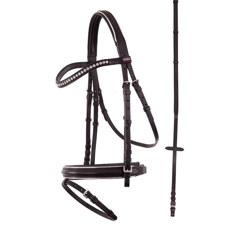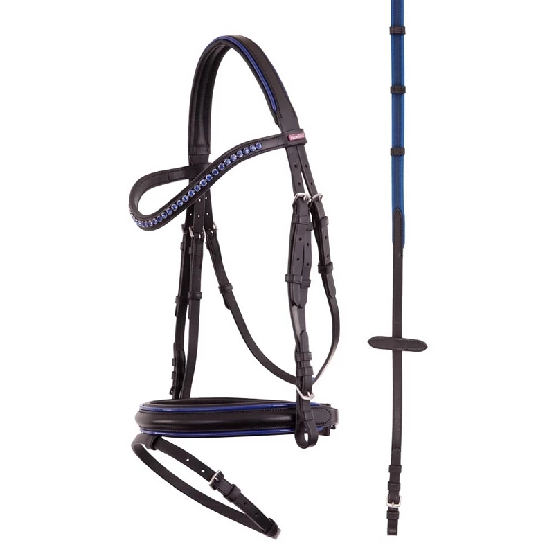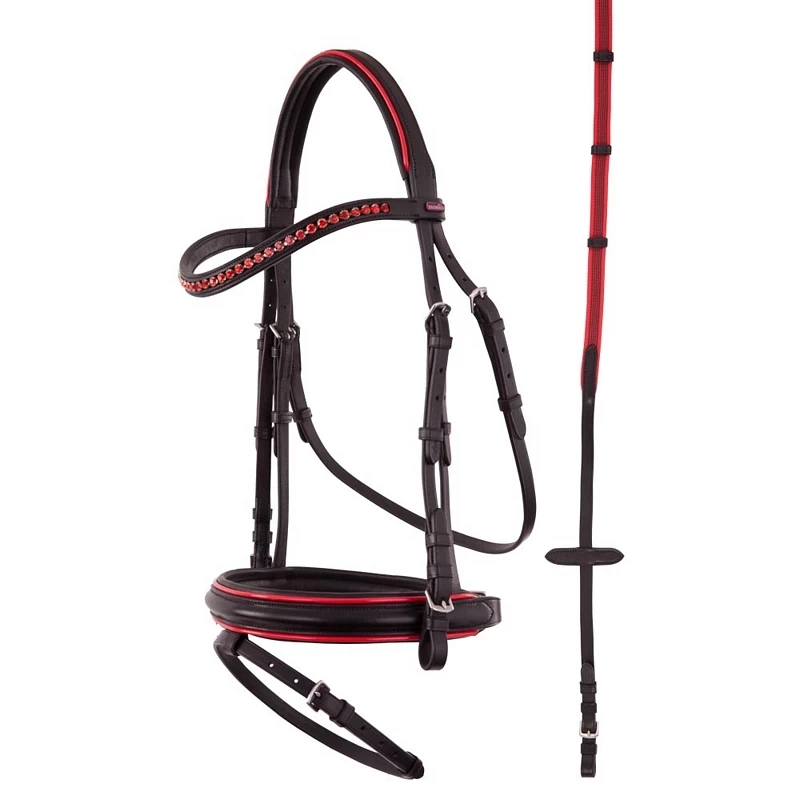 This symmetric bridle is made of beautifully finished leather. Its softly padded headpiece is cut back around the ears and embellished with patent leather piping in contrast colour. The curved browband is encrusted with coloured imitation diamonds and features soft leather facing. The throatlash can be adjusted on both sides and the cheekpieces are fitted with buckles. The bridle has a flash noseband (approx. 3.5 cm), which is embellished with double patent leather piping in contrast colour, similar to the headpiece. The noseband is round raised and softly padded. The bridle features shiny, silver-coloured fittings