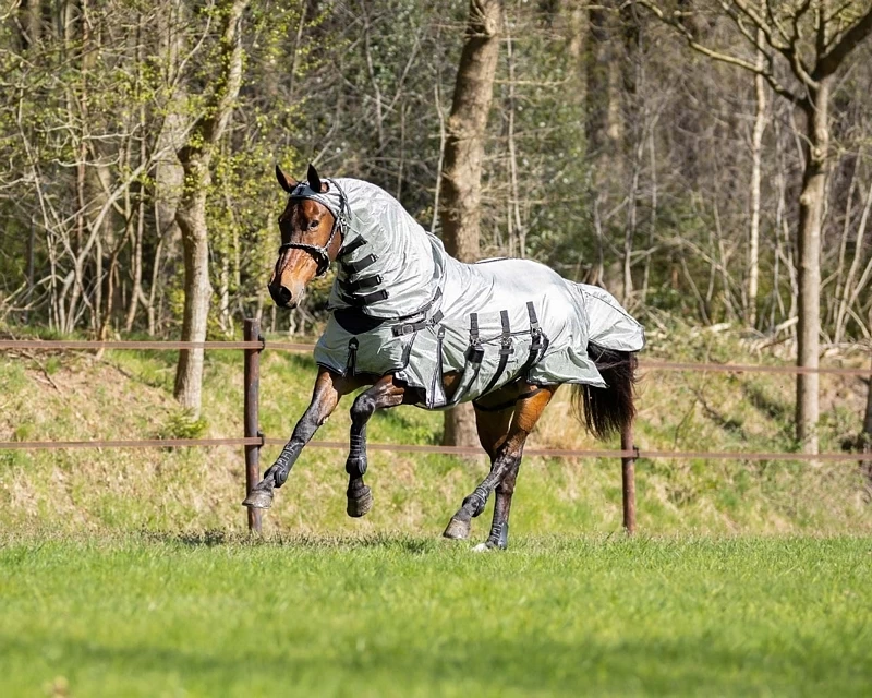 The fly sheet is fitted with chest and shoulder gussets, belly flap, elastic leg chords and a long neck that continues on to the head with openings for the ears. The front fasteners are located on the side of the sheet so they do not irritate the middle of the chest and neck area. The elastic on the front ensures that no pressure can come on the horses windpipe. The special girth fasteners in PresTeq form provide extra convenience with a turn and click fastener. The fly sheet is lined with nylon at the mane, forelock, shoulders and tail flap to prevent chafing. The tail flap is extra wide for optimal protection and features an anatomical ShapedTEQ. This means that the tail flap has been cut back further for extra freedom of movement of the tail.