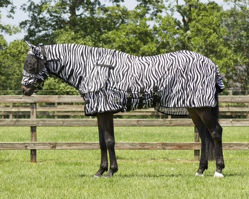 During warm summer months horses can be bothered by flies, nats, horseflies and other pesky insects. We have several fly sheets to protect your horse against them, like this fly sheet with neck and hood. This rug has a detachable neck and hood, which can be taken off when flies and other insects are less active. The rug has a belly flap which fits nicely around the belly and is attached twice with Velcro and surcingles which prevents it from shifting.