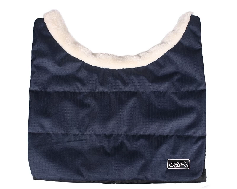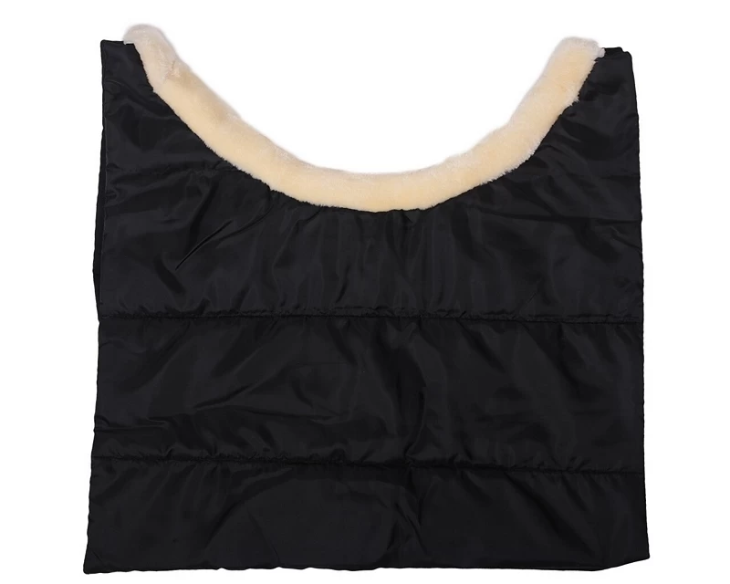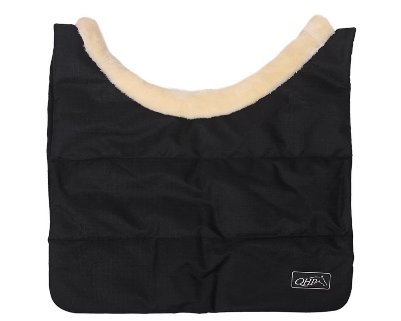 Chest protector Ontario features soft padding and a faux wool collar. A chest protector is used under a rug and the perfect solution for horses that are susceptible to chafing. The protector is placed around the front closure of the rug and can be closed with velcro at the bottom.