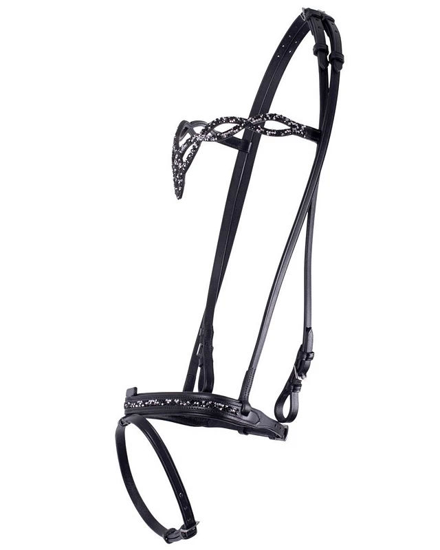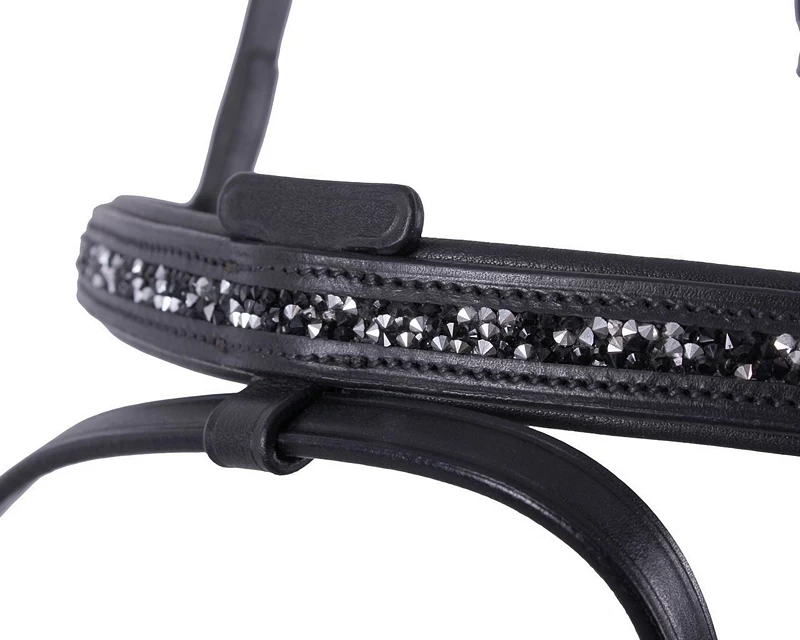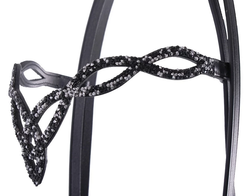This striking Icelandic bridle has a brow band with silver and black scattered rhinestones and a Celtic knot shape. The padded noseband is inlaid with the same rhinestones and features a removable flash strap.
