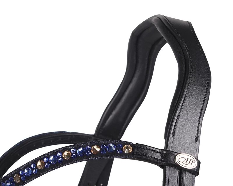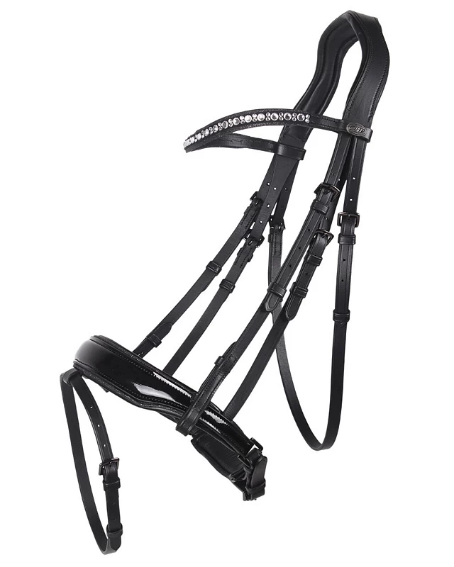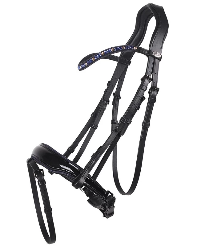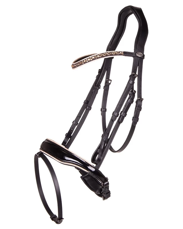 This elegant bridle with a patent leather noseband is the perfect combination of elegance and comfort. The browband is covered with rhinestones that sparkle beautifully. Thanks to the anatomically shaped headpiece and noseband with soft padding, the bridle is very comfortable to wear. The glitter border around the patent leather noseband completes the elegant look.