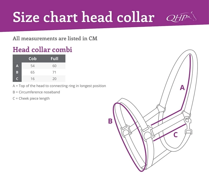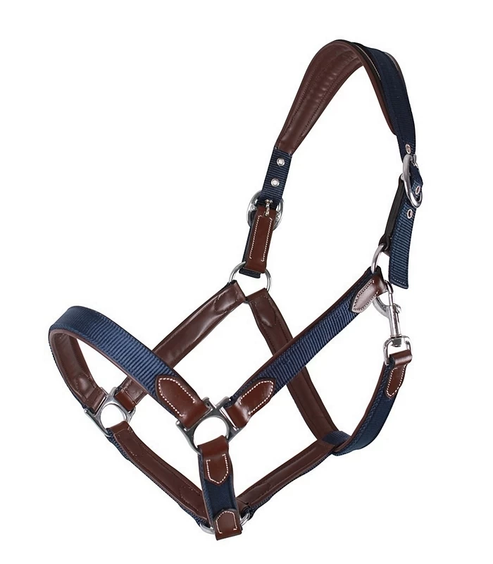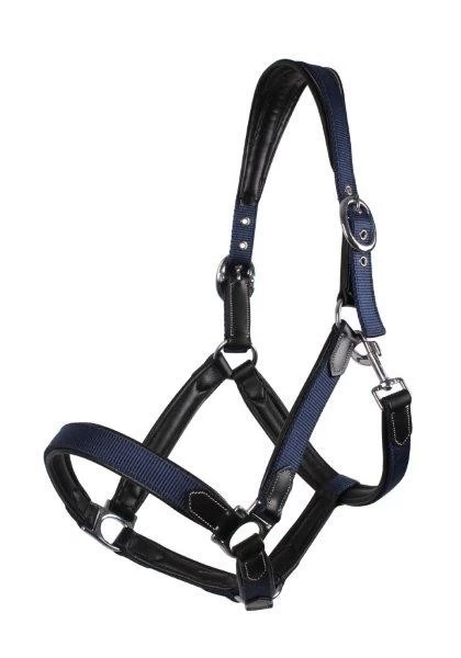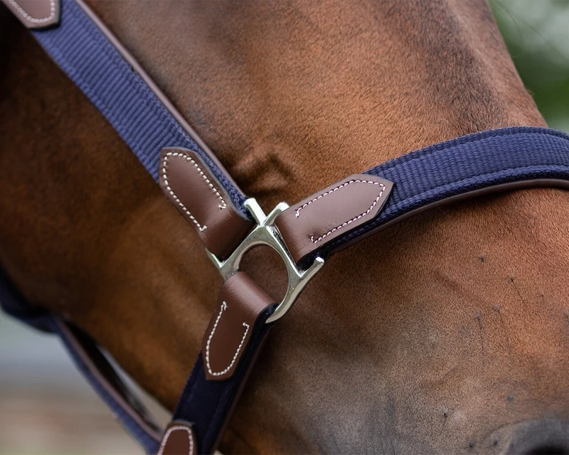 This sturdy nylon head collar is completely lined with soft leather. Near the hardware pieces the head collar is finished with leather and white stitching for a robust look. The crown piece is extra wide and adjustable on both sides.