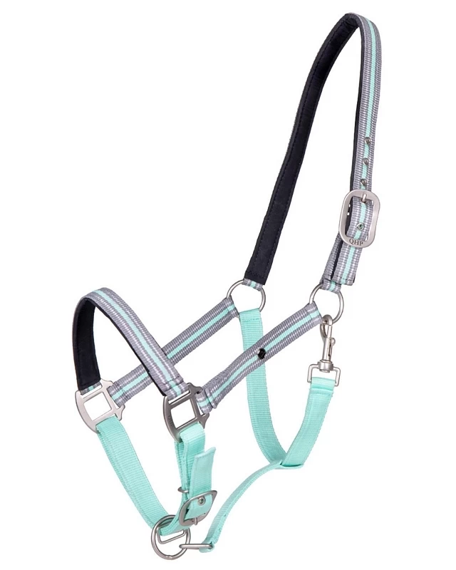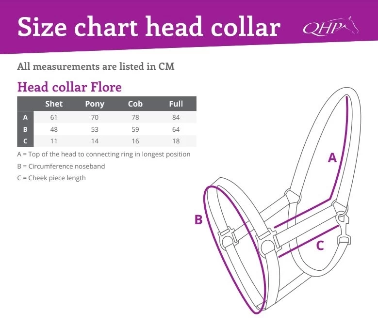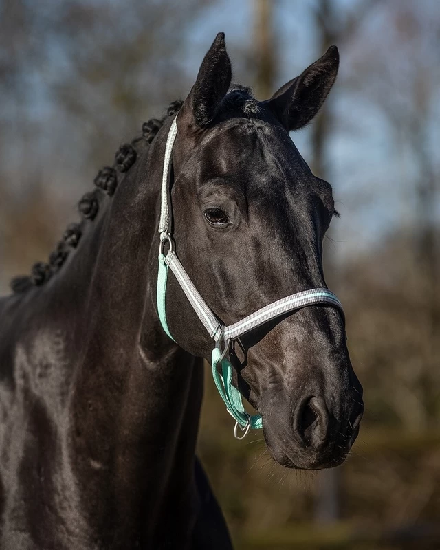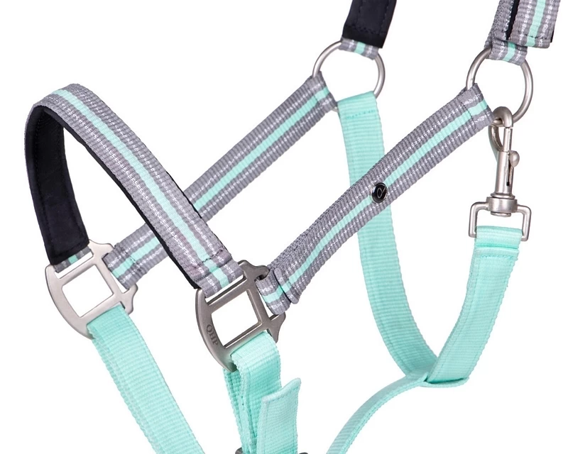 Strong head collar with noseband, headpiece and cheekpieces in contrasting colours. The noseband and headpiece of the halter are adjustable and softly padded. Want to know what size your horse needs? Check out the size chart.