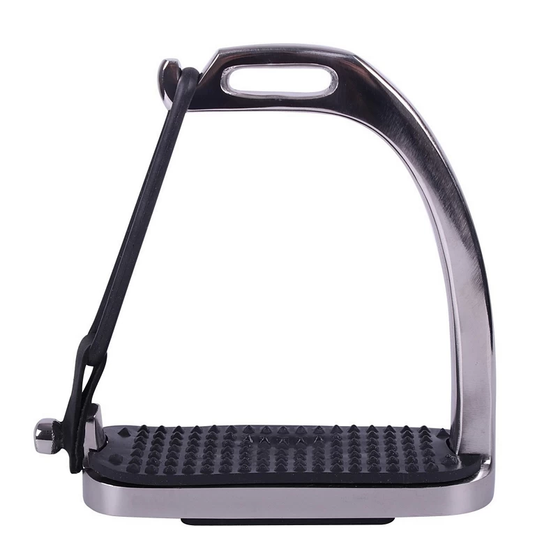 This safety stirrup makes sure the foot of the rider will not get stuck in the stirrup during a fall. The elastic ring on the side will disconnect due to the pressure.
